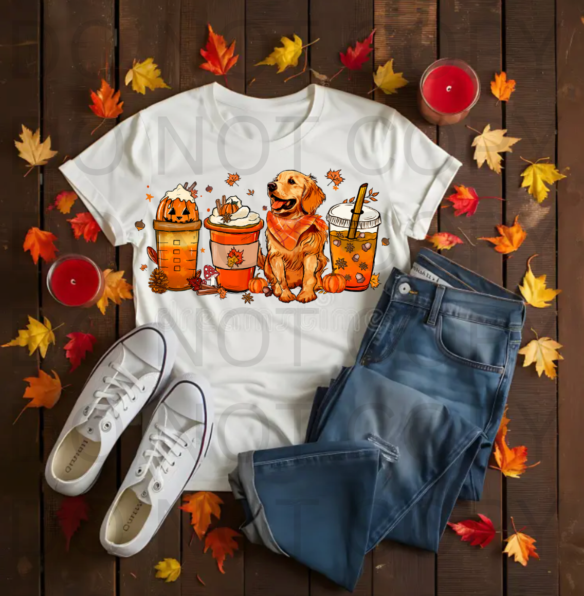 Golden Retriever & Fall Drinks #5588 - Ready to Press DTF Transfer Full Color